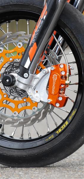 This compact sized 4-piston caliper is especially developed for Supermoto racing and is made of billet CNC machined aluminum. It is Moto-Master-orange anodized to perfectly match the Supermoto race rotors. Allows use of stock brake pump.
